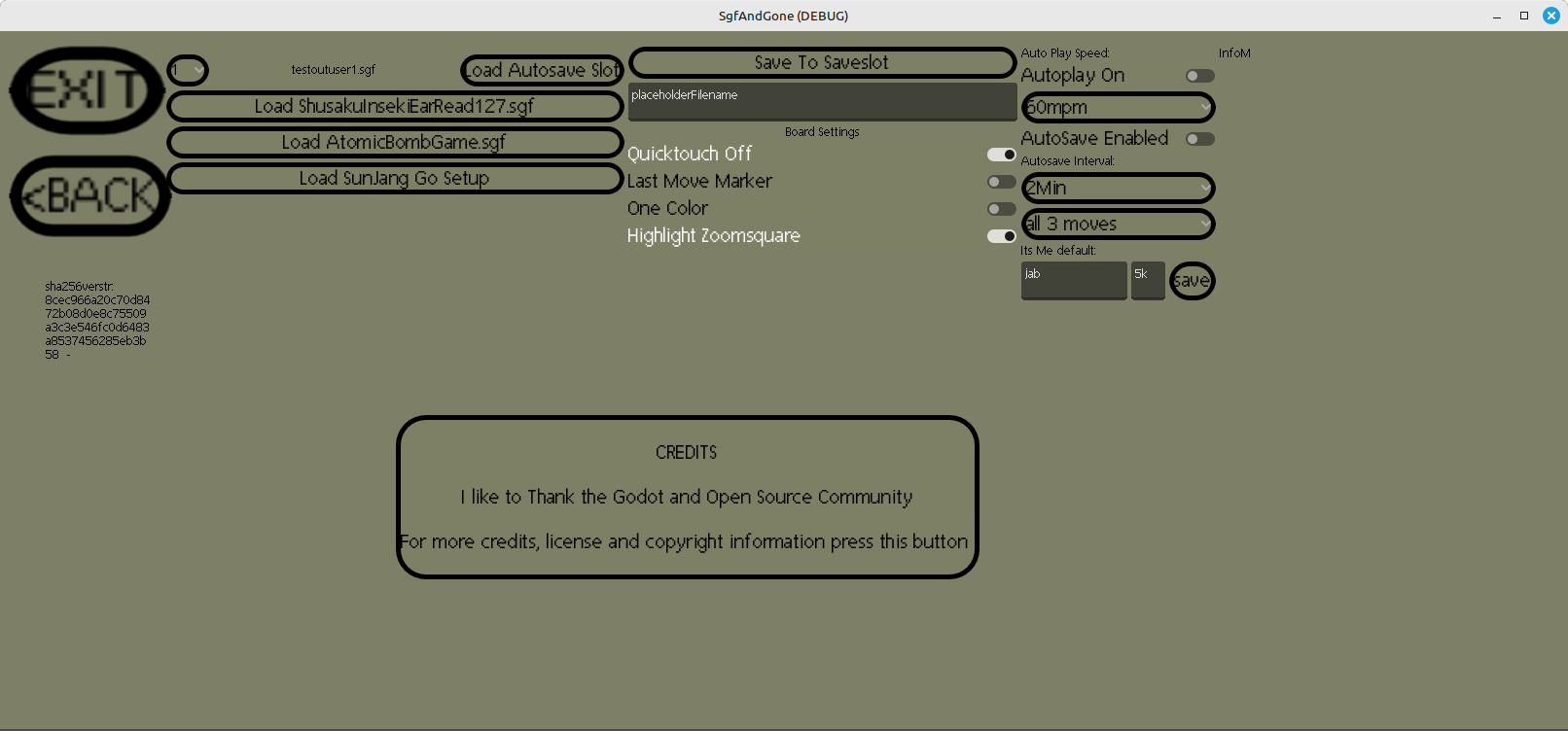 The overview board background including the lines is a copy from Senseis Library. https://senseis.xmp.net/ SL is in general a great source for all kind of Go related information and it dates back to before Wikipedia times The Create - The New Variation dialog and its logic is inspired by the PalmOS Software PilotGone https://harryfearnley.com/go/pg/pilotgone-0.8.1/doc/pgleft.html To recreate it the PalmPilot Font and GIMP was used. Here the License for the